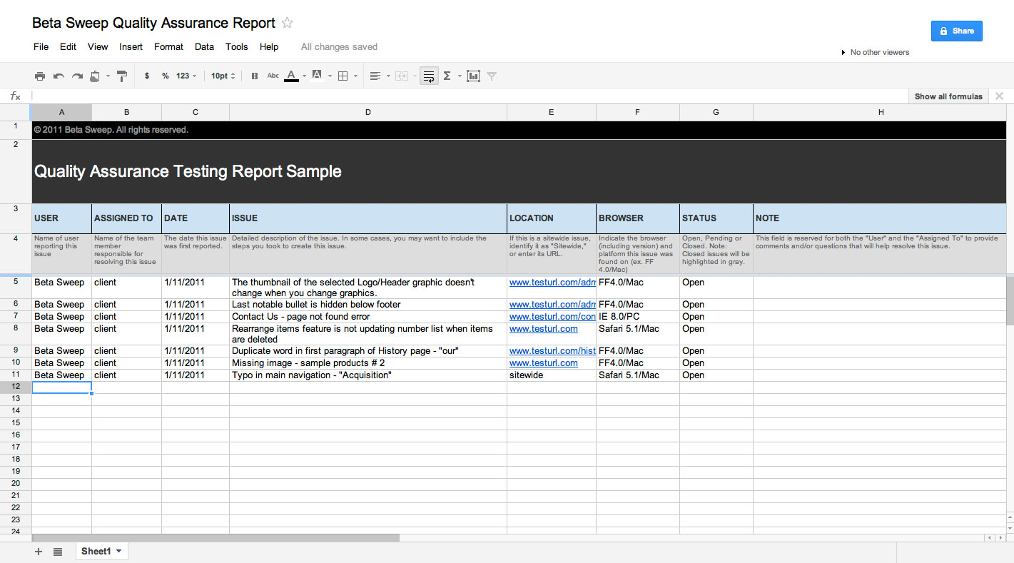 Upon completion of the sweeping phase, I will deliver a user-friendly report of the results. The report will include: error descriptions, page links, error status, identified browser, the ability to assign responsibility, comments, screen captures (if necessary), and steps to recreate errors (if necessary).